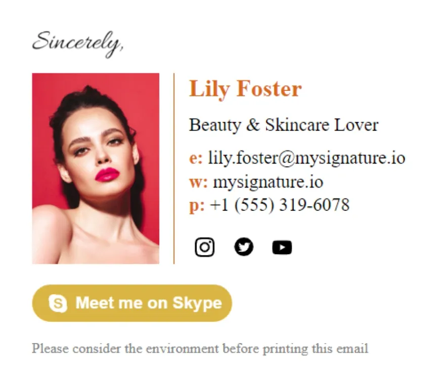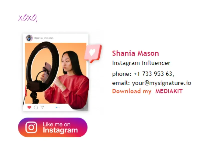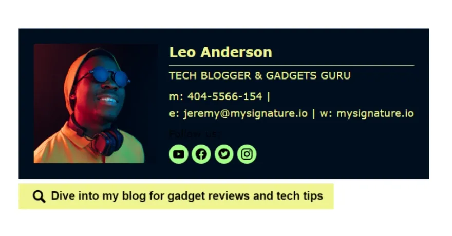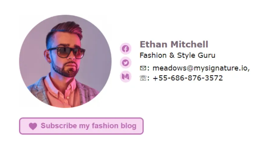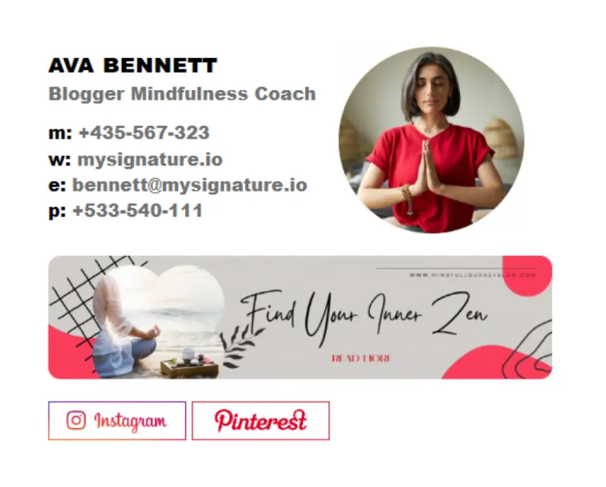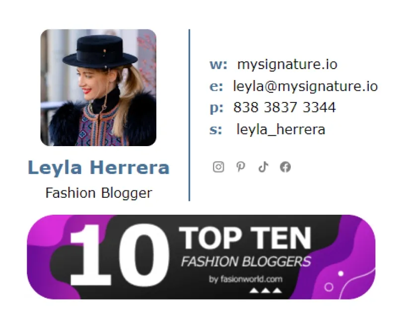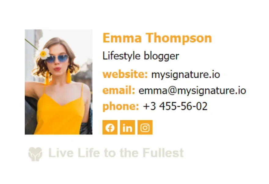 Vous êtes sur le point de créer votre meilleure signature d'email pour blogueur lifestyle ? Il vous faudra sûrement des exemples de signatures d'email pour blogueurs adaptées à la vibe lifestyle. Elles ont toutes été faites avec l'aide de MySignature.