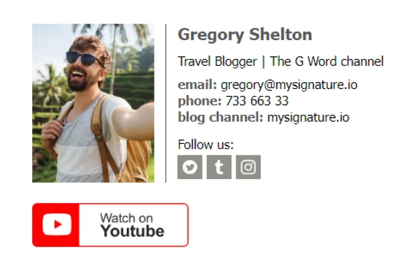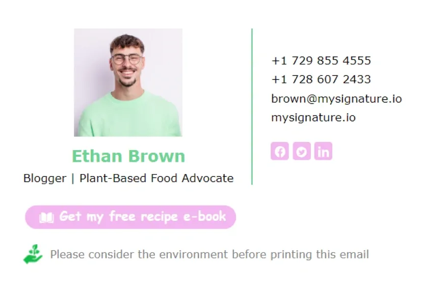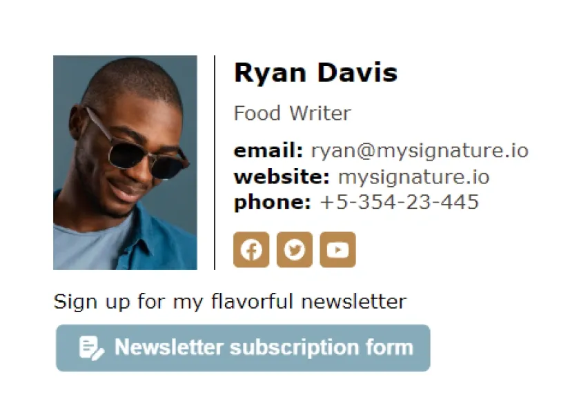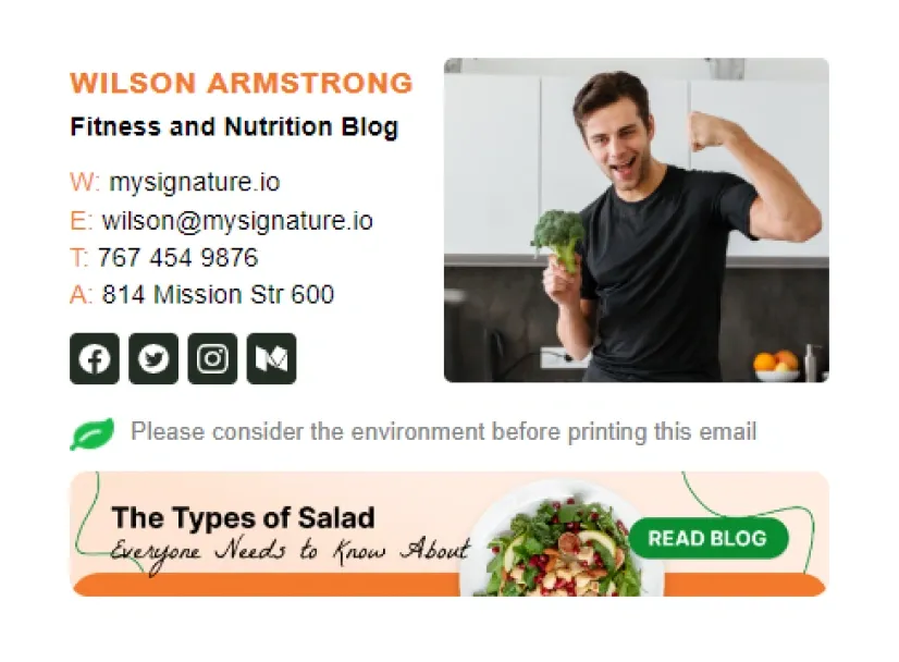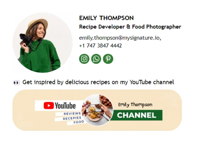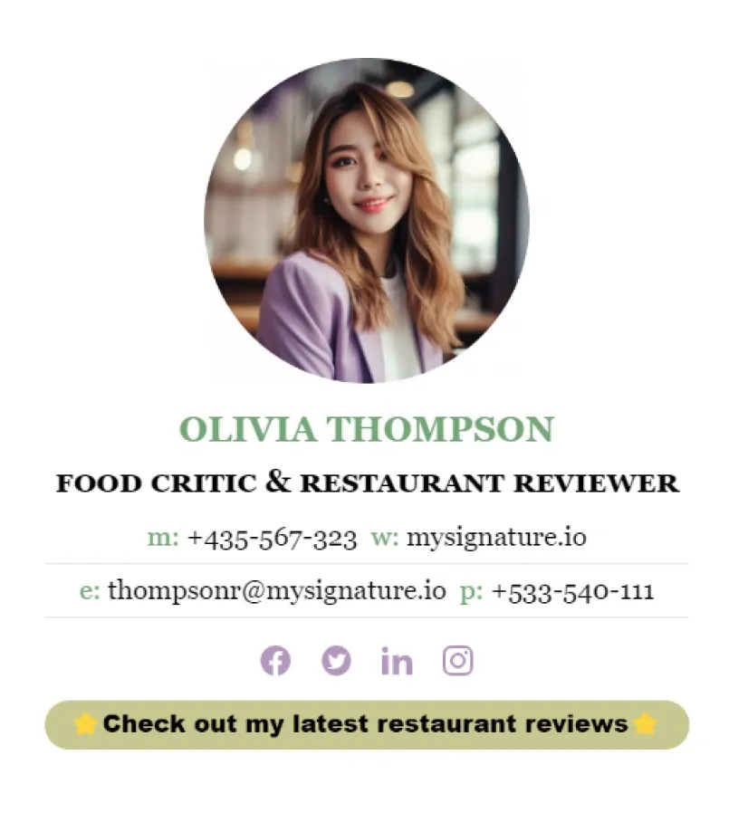 Il s'agit de quelques modèles de signatures d'email pour tout type de blogueur, dont vous pouvez vous inspirer. Si vous êtes blogueur culinaire, vous devriez parcourir quelques bons exemples de signatures d'email pour influenceurs culinaires.
