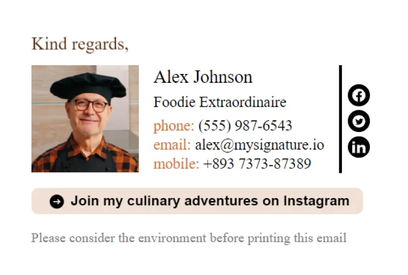 Traitez votre signature d'email comme un canal marketing. Ajoutez des icônes de réseaux sociaux à votre signature d'email professionnelle pour encourager les destinataires à vous suivre sur les différents réseaux sociaux. Vous pouvez aussi utiliser des appels à l'action dans votre signature d'email pour promouvoir votre dernier article de blog ou une offre spéciale auprès d'un public plus large. Par exemple, dans une signature d'email pour blogueur culinaire, ce serait pertinent de fournir des liens vers vos dernières recette ou d'ajouter un appel à l'action pour réserver une place pour votre dernière masterclass de cuisine.
