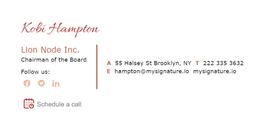 Maintenant que vous savez créer une signature d'email pour propriétaire d'entreprise, voyons ce que ça donne en pratique. Voici quelques bons exemples de signatures d'email pour propriétaire/président créées à l'aide de MySignature.