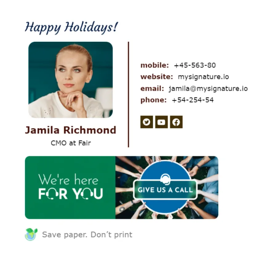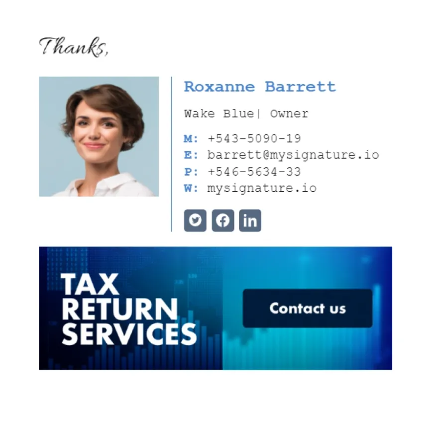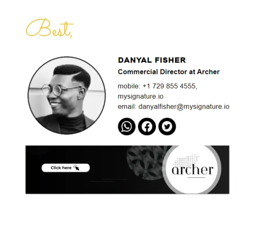 Si vous souhaitez créer des signatures d'email attractives et informatives, pensez aux bannières. En les utilisant stratégiquement dans le design de votre signature d'email, vous pouvez renforcer l'impact visuel et l'efficacité de vos communications par email. Pensez donc à ajouter une bannière attractive alignée sur votre identité de marque et affichant des informations importantes ou des promotions. Cependant, veillez à ce que la bannière n'éclipse pas le design global et ne distraie pas du contenu principal de vos emails.