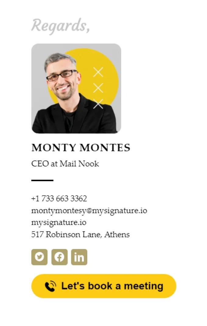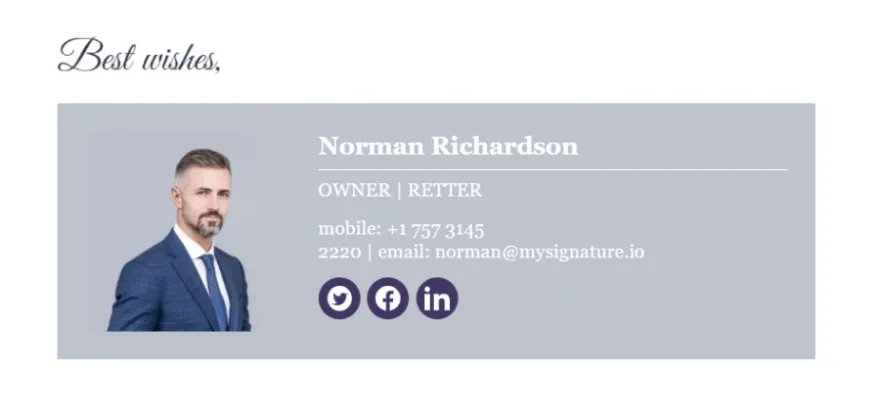 Avec l'utilisation croissante de smartphones, il est crucial de créer des signatures d'email pour propriétaires de petites entreprises s'affichant correctement sur les écrans d'appareils mobiles. Il faut aussi les tester sur plusieurs clients de messagerie et ajuster le format si nécessaire pour garantir une apparence cohérente et professionnelle. En utilisant une solution fiable de signature d'email comme MySignature, vous pouvez facilement créer une signature professionnelle et visuellement attractive transmettant le message de votre marque quel que soit l'appareil ou la plateforme de messagerie du destinataire. Nous vous montrerons ci-dessous de beaux exemples de signatures d'email pour propriétaires d'entreprise.