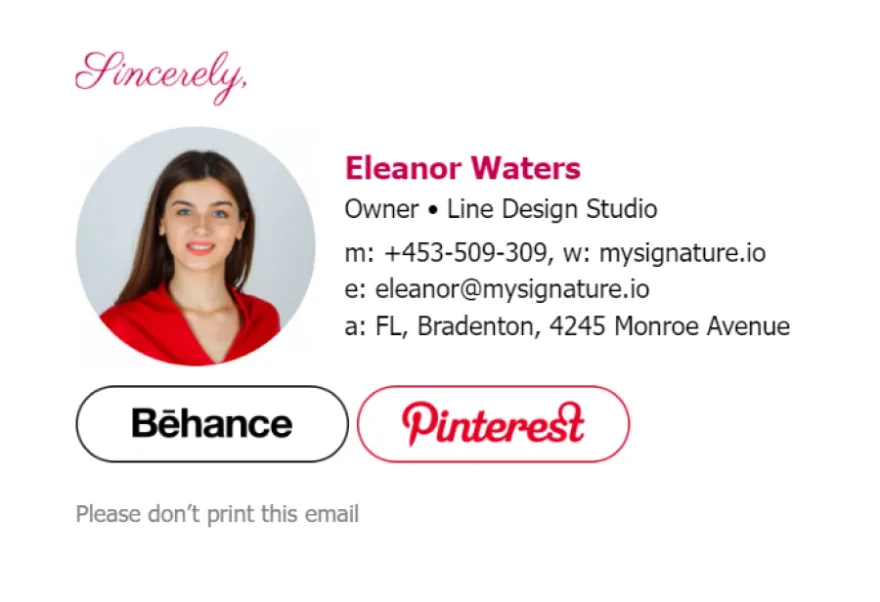 Si vous voulez une belle signature d'email, optez pour un design épuré et concis ne contenant que les informations les plus pertinentes. N'ajoutez pas votre adresse email.