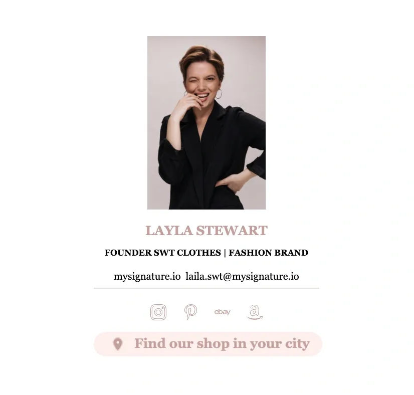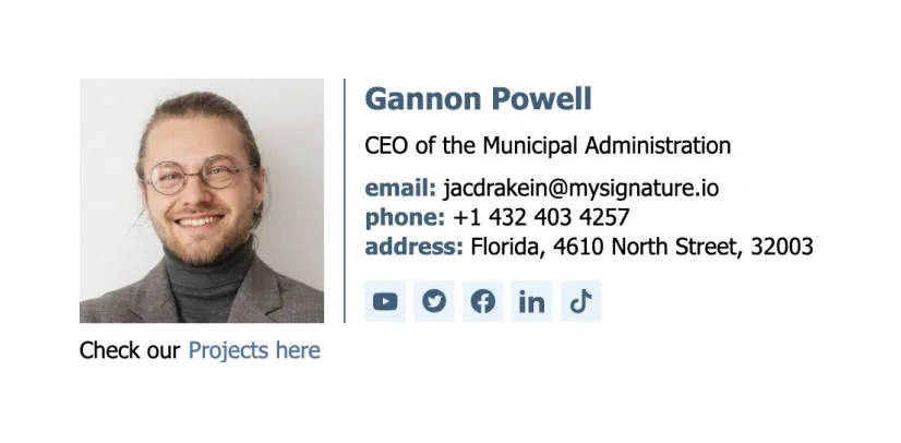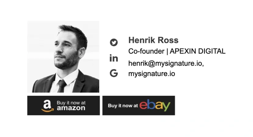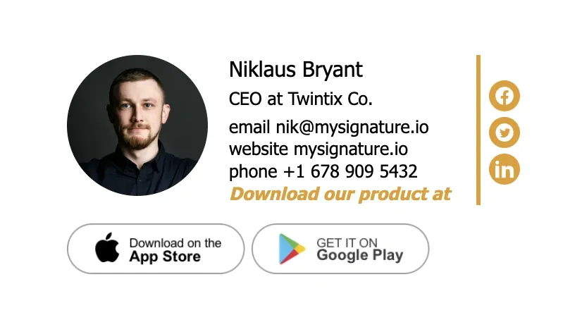 Plusieurs exemples mémorables de signatures d'email de PDG comportent des icônes de réseaux sociaux. Elles permettent de promouvoir les profils de votre entreprise sur les réseaux sociaux (LinkedIn, Facebook, Twitter, etc.) et de permettre aux gens de se connecter à vous plus facilement sur leurs plateformes préférées.