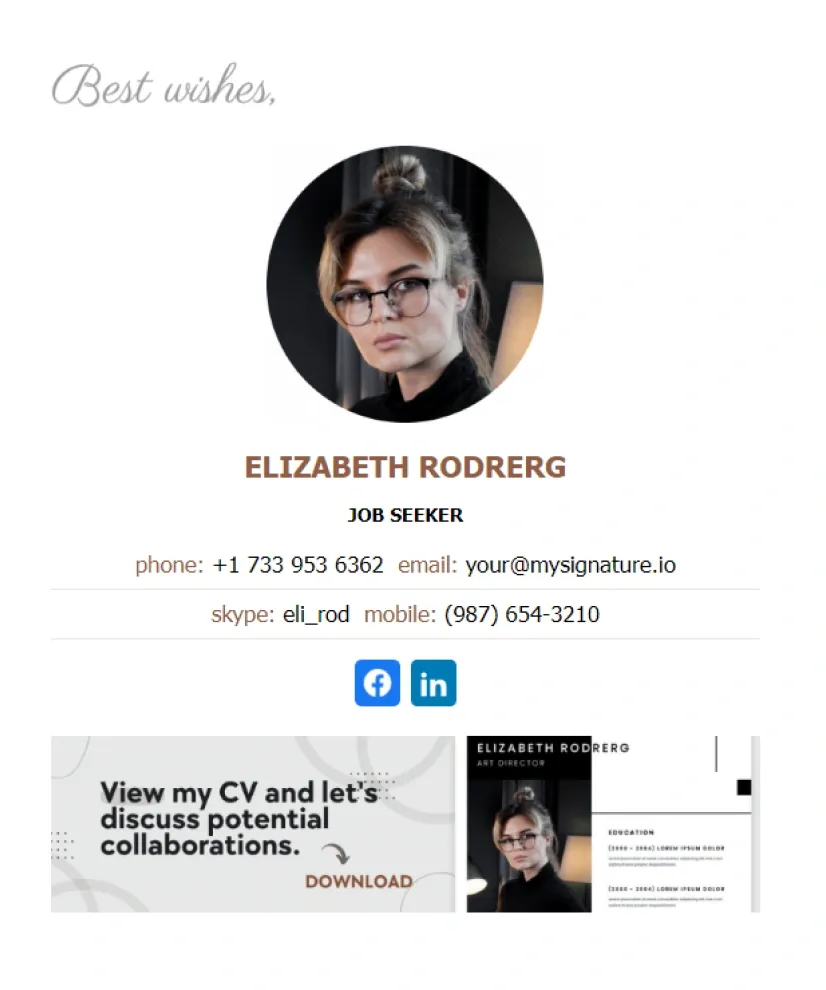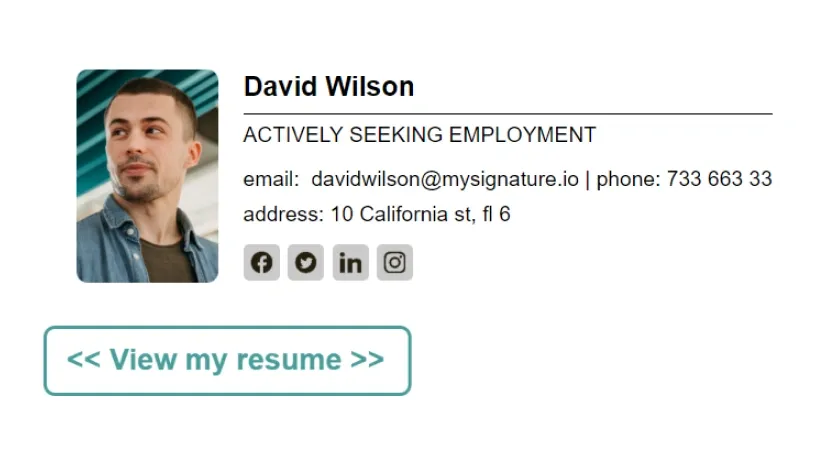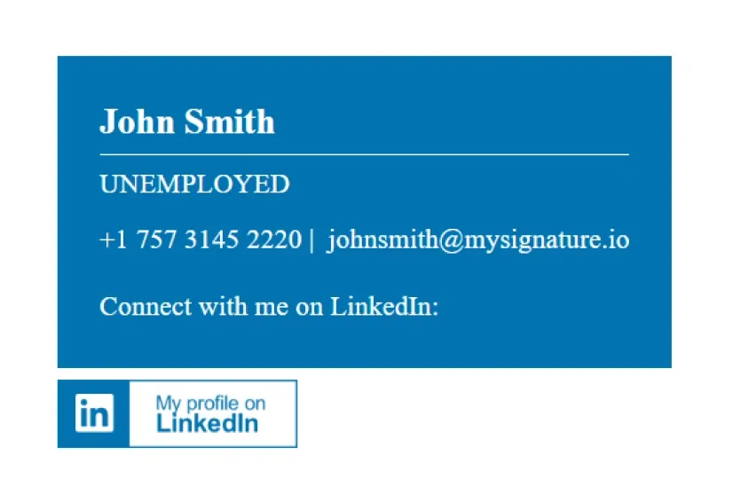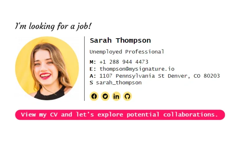 Essayez ces modèles de signature pour chercheur d'emploi. Plus de modèles professionnels de signatures d'email pour les personnes sans emploi sont disponibles sur MySignature.