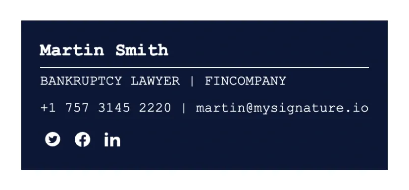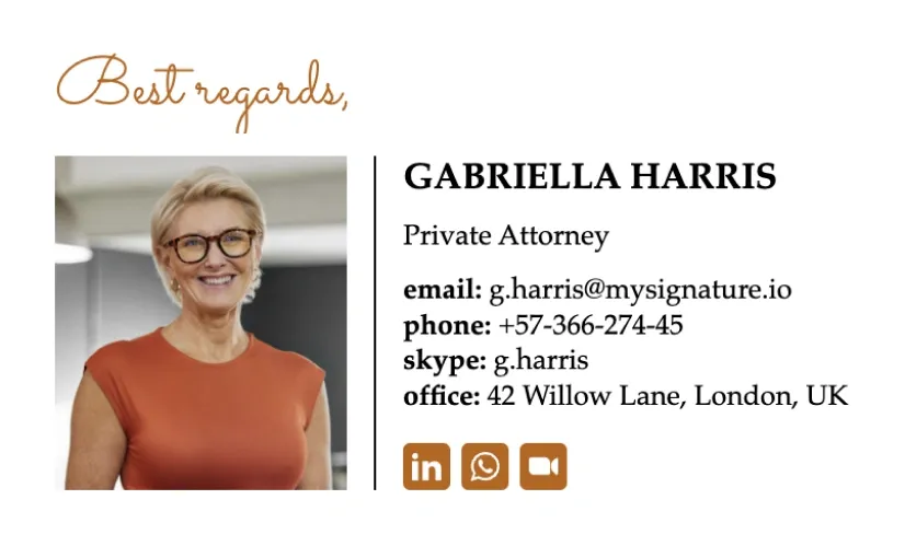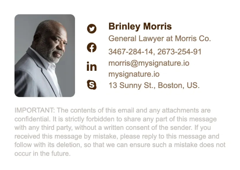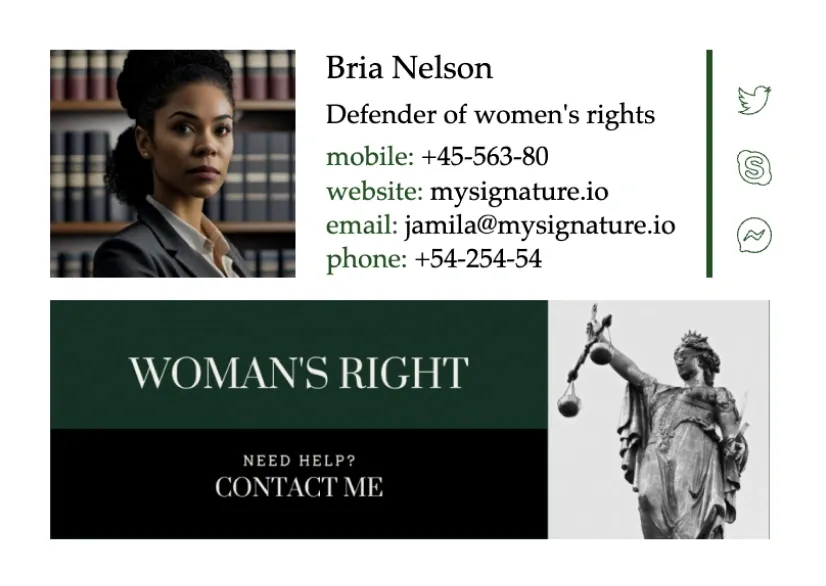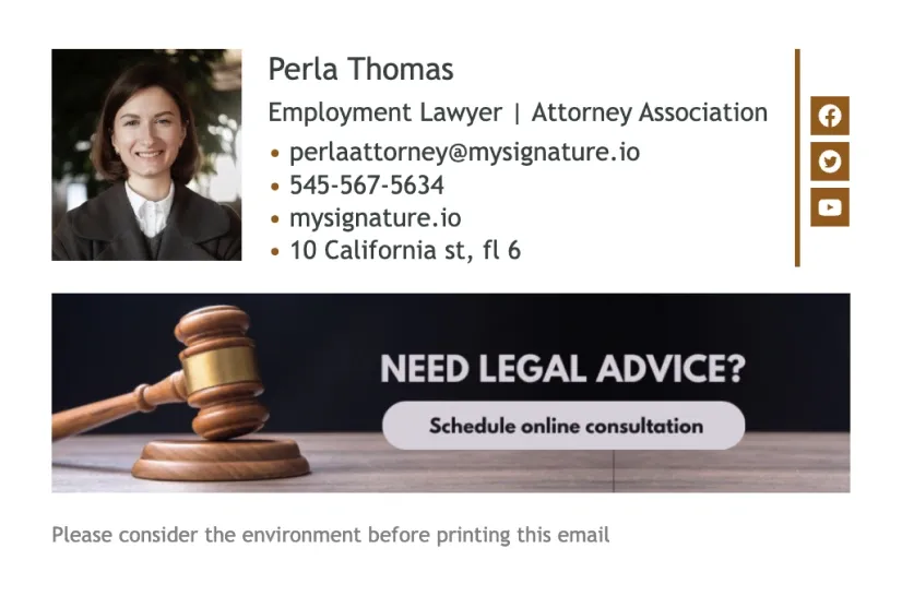 Attorney email signature examples can help attorneys and lawyers create clean and meaningful email footers. In this section, you’ll find the best attorney email signature templates created with our email signature generator MySignature.
