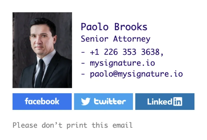 If you work for a company or have your own business, you can include your logo. Many professional lawyer email signature examples include a photo of the sender (note that this should be a professional photo). This can help the reader associate your image with a name. Both elements give your law firm a polished and professional look.