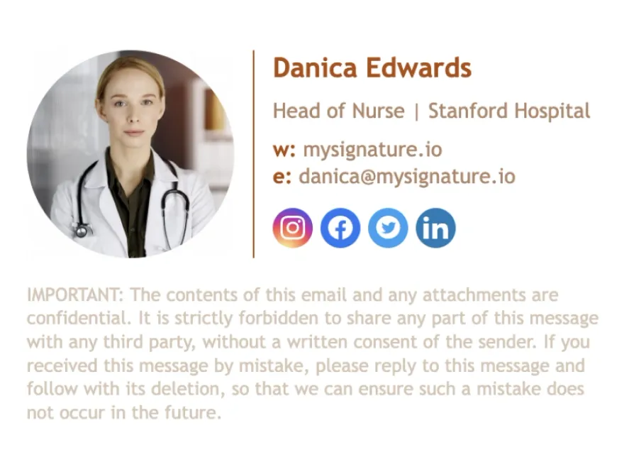 Allow the recipient to stay connected with your hospital on a professional and social level by providing easy access to official social profiles (Facebook, LinkedIn, Twitter, etc). If you want to make your signature interactive and professional-looking, try the MySignature.io email signature generator that will help you design a perfect sig in minutes.