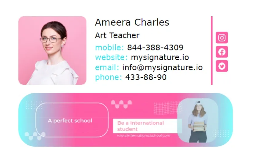 Créer une signature d'emailIl peut être difficile de tenir les élèves et les parents informés. Si vous avez un lien important à partager, ou des événements à venir que vous souhaitez promouvoir comme un voyage scolaire, ou même une page pouvant intéresser ceux avec qui vous communiquez, vous pouvez rendre ces informations plus visibles à l'aide d'une bannière. Avec MySignature, vous pouvez utiliser une gamme de bannière attractives inclues dans notre collection de modèles, qui iront parfaitement avec le deisgn de signature d'email. Avec ceci à votre disposition, c'est beaucoup plus facile de comprendre comment réaliser une signature d'email d'enseignant.