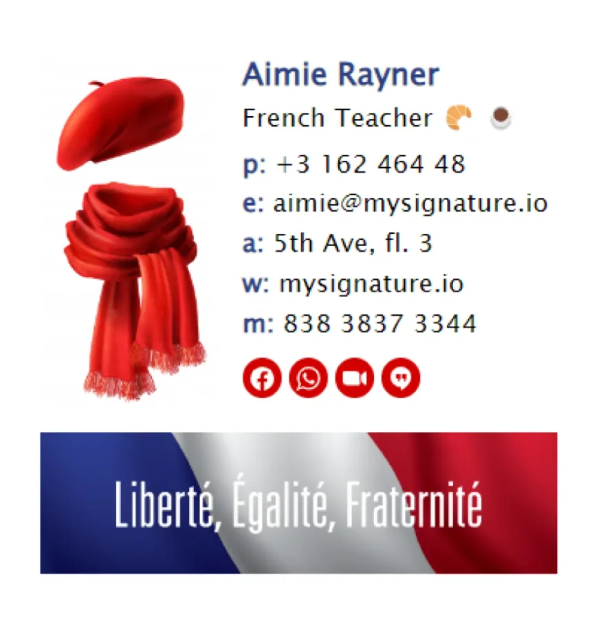 Créer une signature d'emailEn tant qu'enseignant, on peut être tenté d'inclure beaucoup de ressources et d'informations utiles dans sa signature d'email. Mais il est important de garder à l'esprit qu'en même temps, votre signature doit être brève et facile à lire, et ne doit pas encombrer l'email. Il faut bien réfléchir aux informations qu'on décide d'ajouter et s'inspirer des modèles professionnels de MySignature.